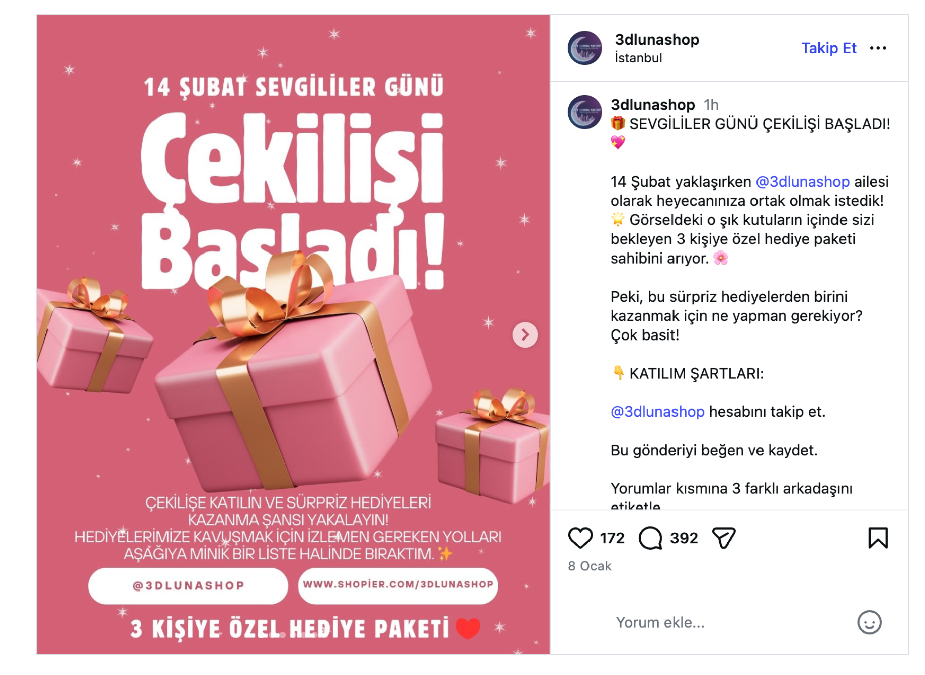 14 Şubat Sevgililer Günü, Instagram’da markalar, butikler, küçük işletmeler veya ınfluencerler için yalnızca romantik bir özel gün değil; aynı zamanda etkileşimi artırmak, yeni takipçiler kazanmak ve marka sadakati oluşturmak için büyük bir fırsattır. Özellikle doğru planlanmış bir Instagram çekilişi, kısa sürede yüksek görünürlük ve güçlü geri dönüşler sağlar.